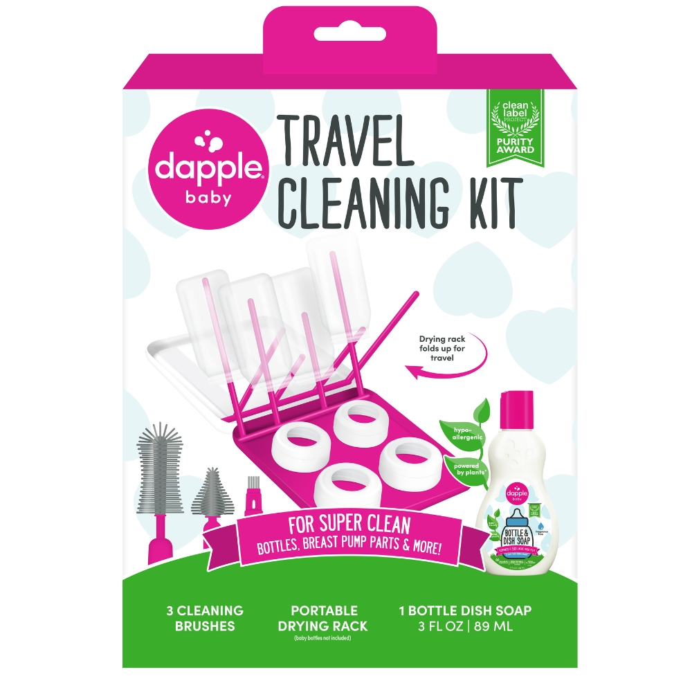 Includes a travel size Dapple Baby Bottle & Dish Soap (3 oz), a compact foldable drying rack and 3 cleaning brushes.
